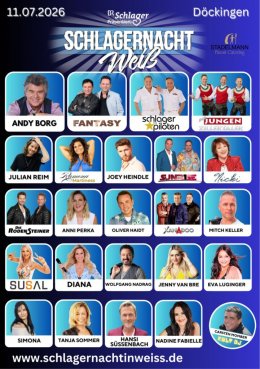 Die legendäre Schlagernacht in Weiß geht 2026 in die nächste Runde! Freut euch auf eine unvergessliche Nacht voller Schlagerklassiker, Rock-Hymnen und echter Stimmungsgarantie – in weißer Kleidung und bester Festival-Atmosphäre.
